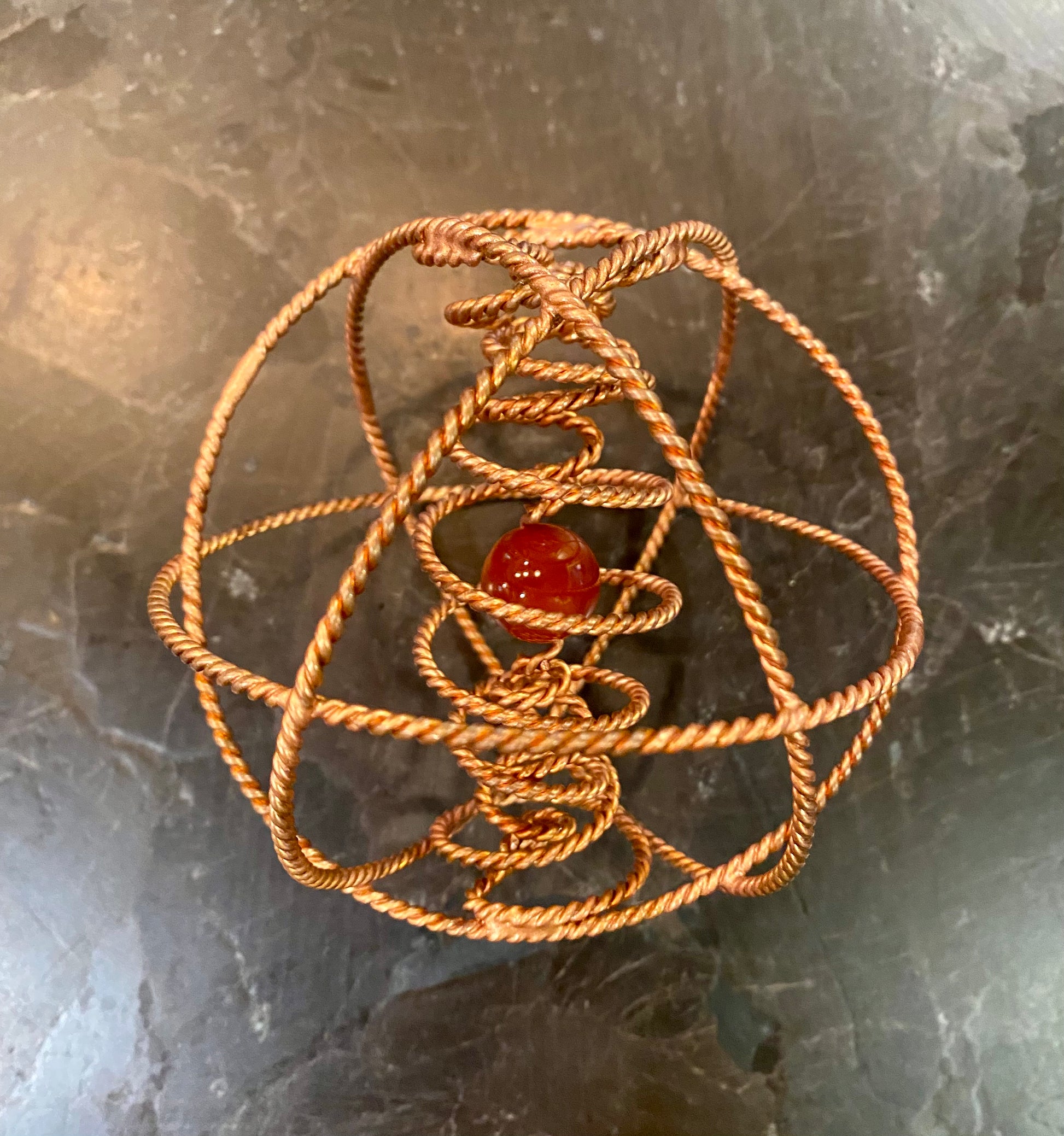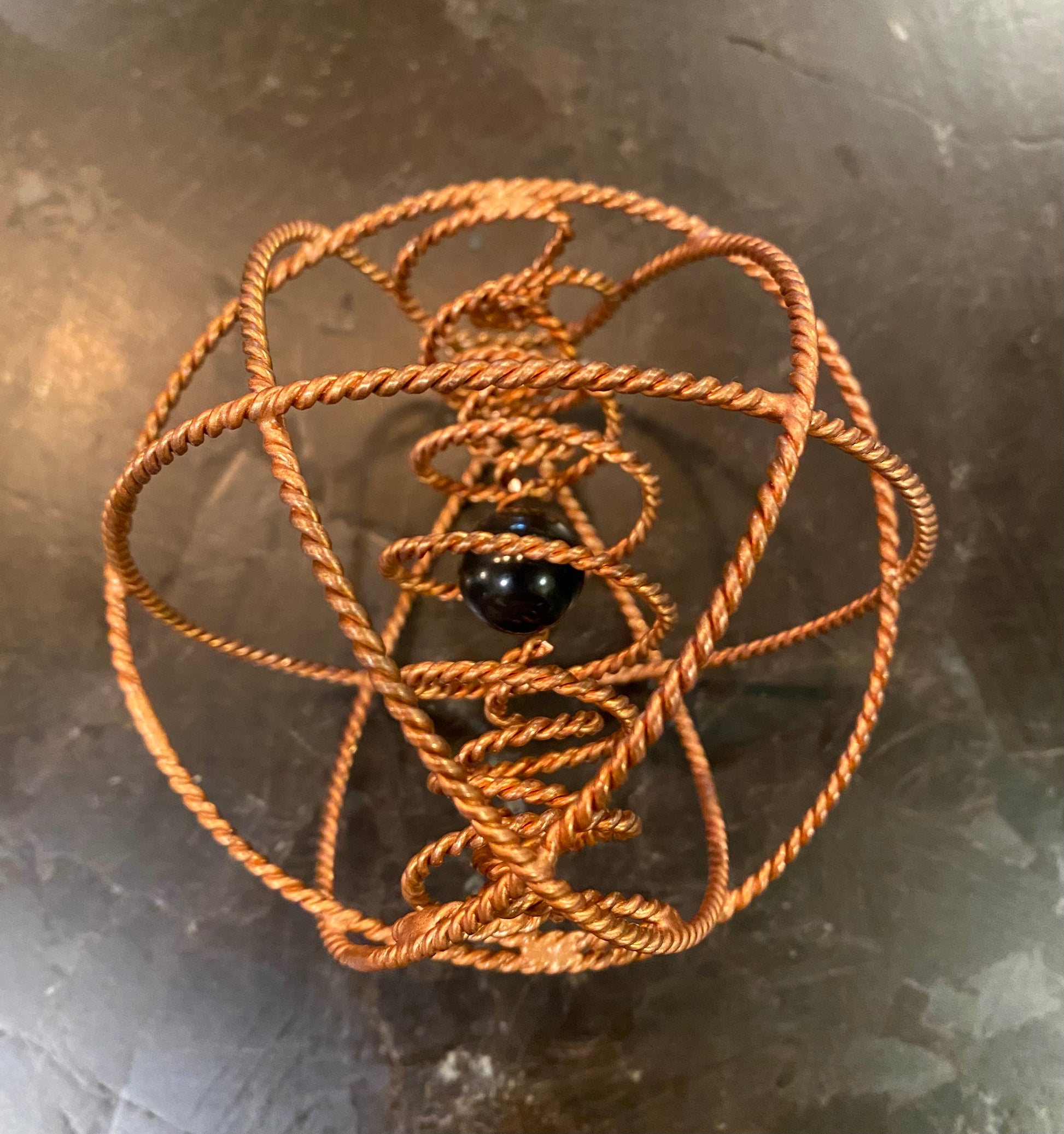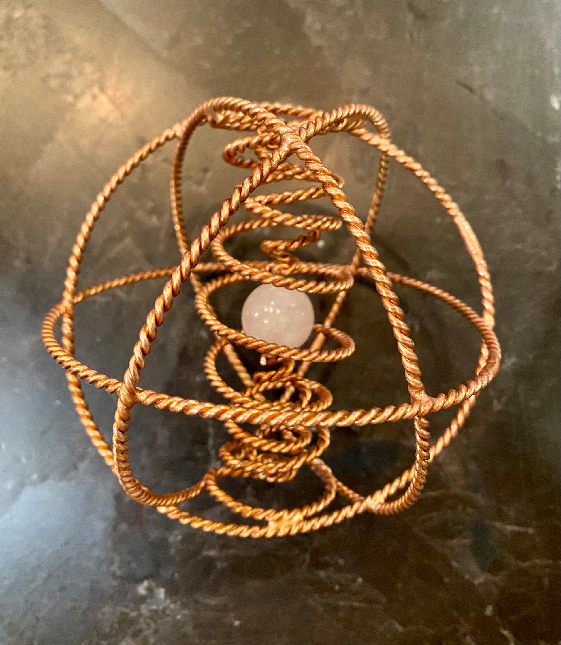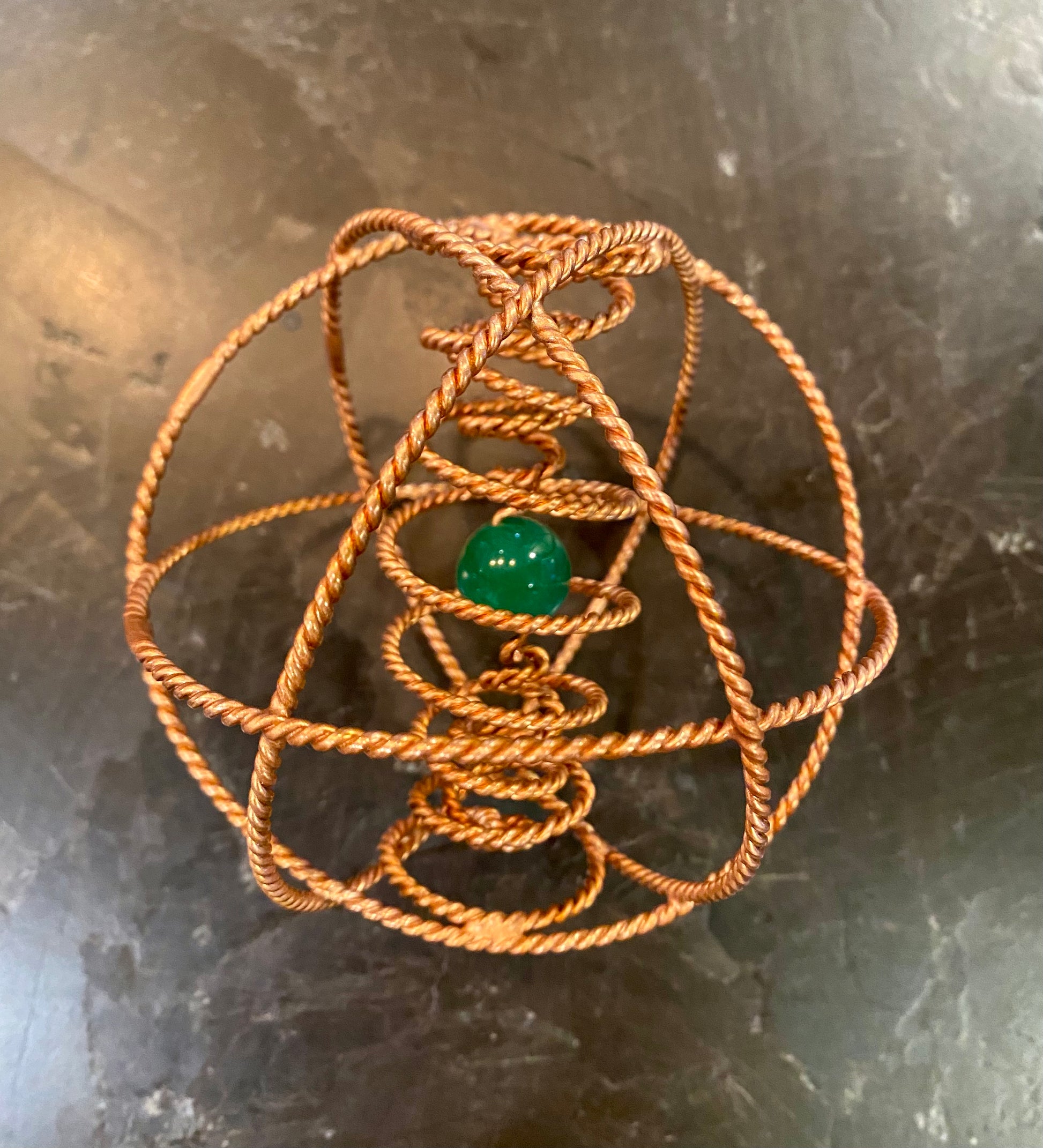 The World Traveler MiniCore is designed for travel and compact spaces, making it perfect for desks, coffee tables, and altars. It can be used as a hands-on meditative tool, an advanced scalar-wave ElectroCulture antenna, a decorative feng shui centerpiece, or suspended from a rotating mobile with fishing line. The device can also be connected to an audio frequency generator and grounding cord to unlock its various potentials. The energetic field generated by the device extends to a radius of 1,700 feet. Handcrafted with electrical-grade copper wire and high-quality gem spheres for maximum benefit.